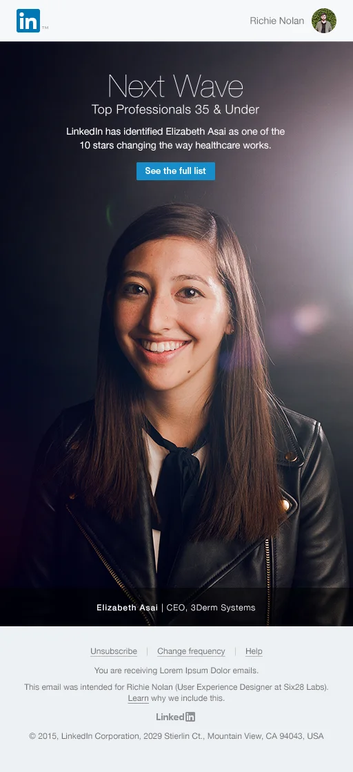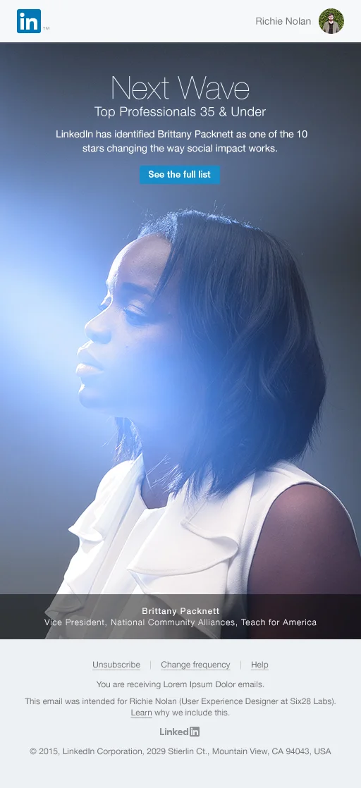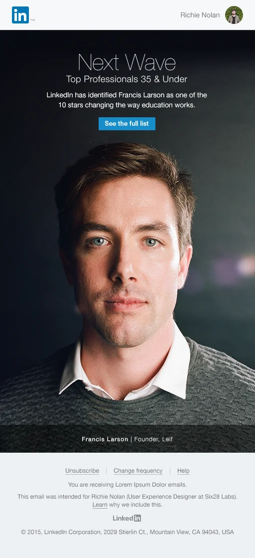 We used targeted emails to drive traffic to the site. If a LinkedIn member worked in the education industry, for example, they received a mail featuring Francis Larson, our honoree whose start up is working to eliminate student loans. I kept the design clean and simple. Marketing emails tend to have a bad rap so I instead opted to treat these like print ads in the hope of achieving a more elegant, less spammy result.